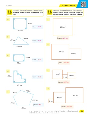 32. Aşağıdaki şekillerin çevre uzunluklarını bulu- 33. Aşağıda içlerine alanları yazılı olan karesel böl-