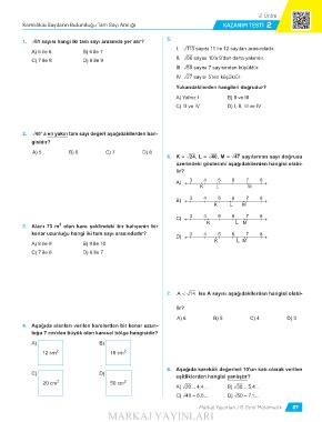 Kareköklü Sayıların Bulunduğu Tam Sayı Aralığı KAZANIM TESTI 2