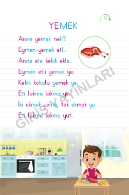 13 YEMEK Anne yemek neli? Eymen yemek etli. Anne ete kekik ekle. GİRİŞ YAYINLARI Eymen etli yemek ye. Kekik kokulu yemek ye. Eti lokma lokma ye. İki ekmek yeme, tek ekmek ye. Eti lokma lokma yut.
