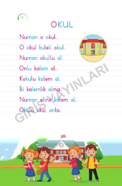 6 OKUL Numan o okul. O okul kuleli okul. Numan okullu ol. GİRİŞ YAYINLARI Onlu kalem al. Kokulu kalem al. İki kalemlik alma. Numan eline kalem al. Okulu oku, anla.