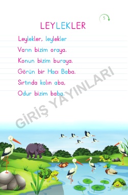 5 LEYLEKLER Leylekler, leylekler Varın bizim oraya. Konun bizim buraya. GİRİŞ YAYINLARI Görün bir Hacı Baba. Sırtında kalın aba, Odur bizim baba.