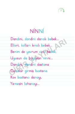 7 NİNNİ GİRİŞ YAYINLARI Dandini, dandini danalı bebek... Elleri, kolları kınalı bebek... Benim de yavrum cicili bebek, Uyusun da büyüsün ninni... Dandini, dandini dastana Danalar girmiş bostana. Kov bostancı danayı, Yemesin lahanayı...