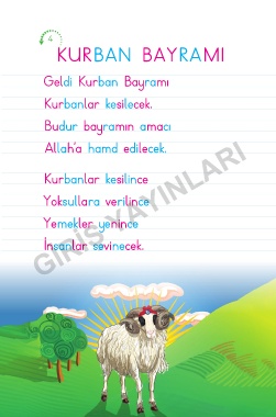 4 KURBAN BAYRAMI Geldi Kurban Bayramı Kurbanlar kesilecek. Budur bayramın amacı GİRİŞ YAYINLARI Allah’a hamd edilecek. Kurbanlar kesilince Yoksullara verilince Yemekler yenince İnsanlar sevinecek.