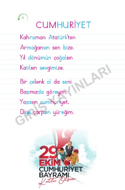 6 CUMHURİYET Kahraman Atatürk’ten Armağansın sen bize. Yıl dönümün çoğalsın GİRİŞ YAYINLARI Katılsın sevgimize. Bir çelenk ol da seni Başımızda göreyim. Yaşasın cumhuriyet, Diye çarpsın yüreğim.