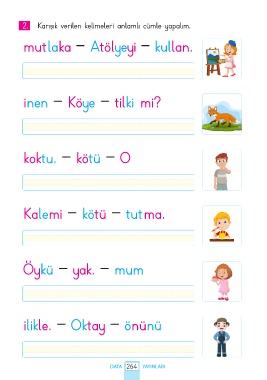 2. Karışık verilen kelimeleri anlamlı cümle yapalım. mutlaka – Atölyeyi – kullan. inen – Köye – tilki mi? koktu. – kötü – O Kalemi – kötü – tutma. Öykü – yak. – mum ilikle. – Oktay – önünü DATA 264 YAYINLARI