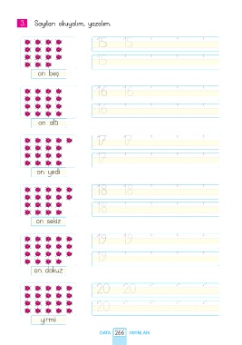 3. Sayıları okuyalım, yazalım. 15 15 15 on beş 16 16 16 on altı 17 17 17 on yedi 18 18 18 on sekiz 19 19 19 on dokuz 20 20 20 yirmi DATA 266 YAYINLARI