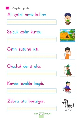 2. Okuyalım, yazalım. Ali çatal bıçak kullan. Selçuk çadır kurdu. Çetin sütünü içti. Okçuluk dersi aldı. Karda kızakla kaydı. Zebra ata benziyor. DATA 344 YAYINLARI