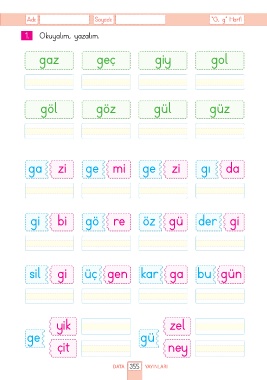 Adı: Soyadı: “G, g” Harfi 1. Okuyalım, yazalım. gaz geç giy gol göl göz gül güz ga zi ge mi ge zi gı da gi bi gö re öz gü der gi sil gi üç gen kar ga bu gün yik zel ge gü çit ney DATA 355 YAYINLARI
