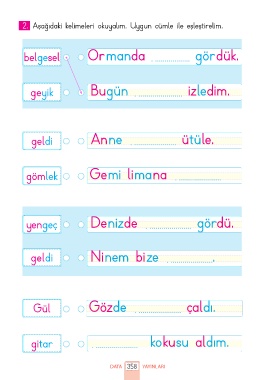 2. Aşağıdaki kelimeleri okuyalım. Uygun cümle ile eşleştirelim. belgesel Ormanda gördük. geyik Bugün izledim. geldi Anne ütüle. gömlek Gemi limana yengeç Denizde gördü. geldi Ninem bize . Gül Gözde çaldı. gitar kokusu aldım. DATA 358 YAYINLARI