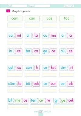 Adı: Soyadı: “C, c” Harfi 1. Okuyalım, yazalım. cam can coş tac ca mi ci la cu ma a cı in ce ba ca ge ce cü ce yol cu can lı ce ket cim ri cüm le bö cek ce sur ca cık bil me ce ten ce re gi ye cek DATA 379 YAYINLARI