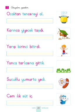 2. Okuyalım, yazalım. Ocaktan tencereyi al. Karınca yiyecek taşıdı. Yarışı birinci bitirdi. Yonca tarlasına gittik. Sucuklu yumurta yedi. Cem ılık süt iç. DATA 380 YAYINLARI
