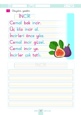 Adı: Soyadı: “C, c” Harfi 1. Okuyalım, yazalım. İNCİR Cemal bak incir. Üç kilo incir al. İncirleri önce yıka. Cemal incir güzel. Cemal incir ye. İncirler çok tatlı. İNCİR DATA 381 YAYINLARI