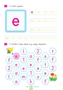 2. “e” harfini yazalım. e e ee e e e e e e e e e e e e 3. “e” harflerini takip ederek arıyı çiçeğe ulaştıralım. l 2 t e a s f 1 f f e e t 2 e e 2 a 1 e l m z a k f DATA 36 YAYINLARI